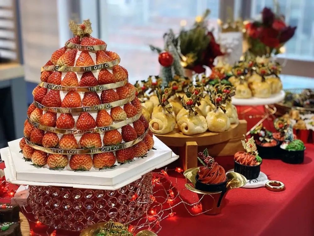 小點(diǎn)心采用了圣誕節(jié)的紅綠配色,紅色的杯子蛋糕、綠色的抹茶曲奇,還有面包上的圣誕鈴鐺裝飾。最巧妙的是,他們把草莓奶油蛋糕做成了圣誕樹造型,好吃又好看。